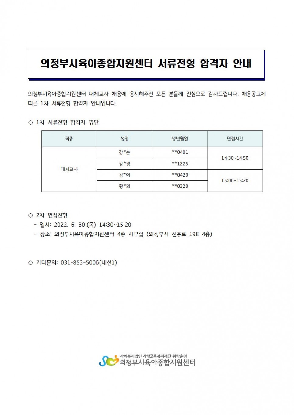 의정부시육아종합지원센터 대체교사 서류전형 합격자발표 페이지 정보 작성자 의정부센터 댓글 0건 조회 1,605회 작성일 2022-06-27 13:33 본문 의정부시육아종합지원센터 대체교사 서류전형 합격자발표 목록 이전글[채용]의정부시육아종합지원센터 직원(운영요원) 채용 공고 22.06.29 다음글찾아가는 공통부모교육 8월 (양육스트레스관리 부모교육) 안내 22.06.27