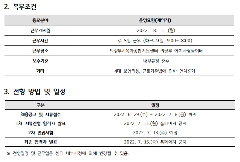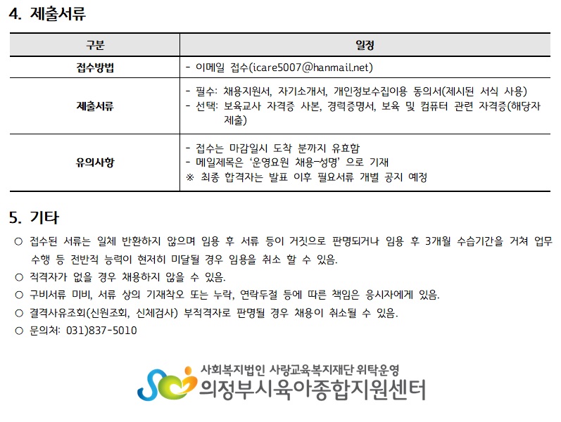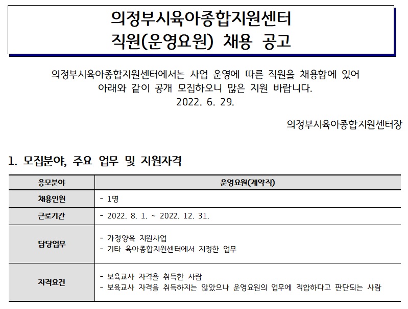 [채용]의정부시육아종합지원센터 직원(운영요원) 채용 공고 페이지 정보 작성자 의정부센터 댓글 0건 조회 1,888회 작성일 2022-06-29 10:27 첨부파일 첨부 채용지원서, 자기소개서, 개인정보수집이용동의서.hwp (21.5K) 28회 다운로드 | DATE : 2022-06-29 10:27:44 본문 의정부시육아종합지원센터 직원(운영요원) 채용 공고 목록 이전글(의정부) 찾아가는 양육상담 '지음' 안내 22.06.29 다음글의정부시육아종합지원센터 대체교사 서류전형 합격자발표 22.06.27