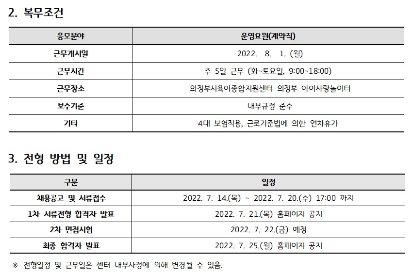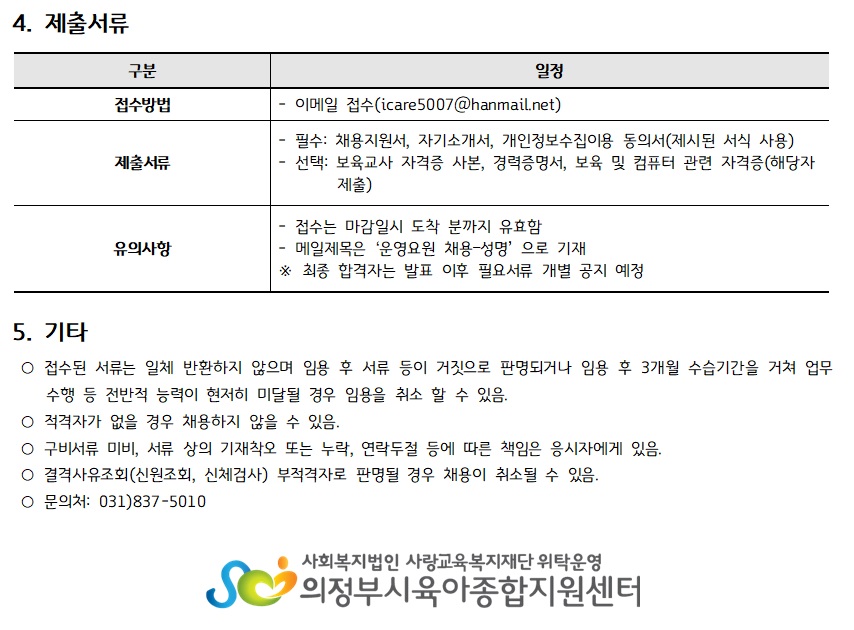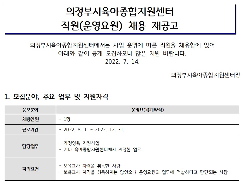 [채용]의정부시육아종합지원센터 직원(운영요원) 채용 재공고 페이지 정보 작성자 의정부센터 댓글 0건 조회 2,106회 작성일 2022-07-14 11:17 첨부파일 첨부 채용지원서, 자기소개서, 개인정보수집이용동의서.hwp (21.5K) 13회 다운로드 | DATE : 2022-07-14 11:17:33 본문 [채용]의정부시육아종합지원센터 직원(운영요원) 채용 재공고 목록 이전글[채용] 의정부시육아종합지원센터 대체교사 채용 재공고 22.07.14 다음글의정부시육아종합지원센터 직원(운영요원) 채용 최종 합격자 안내 22.07.14