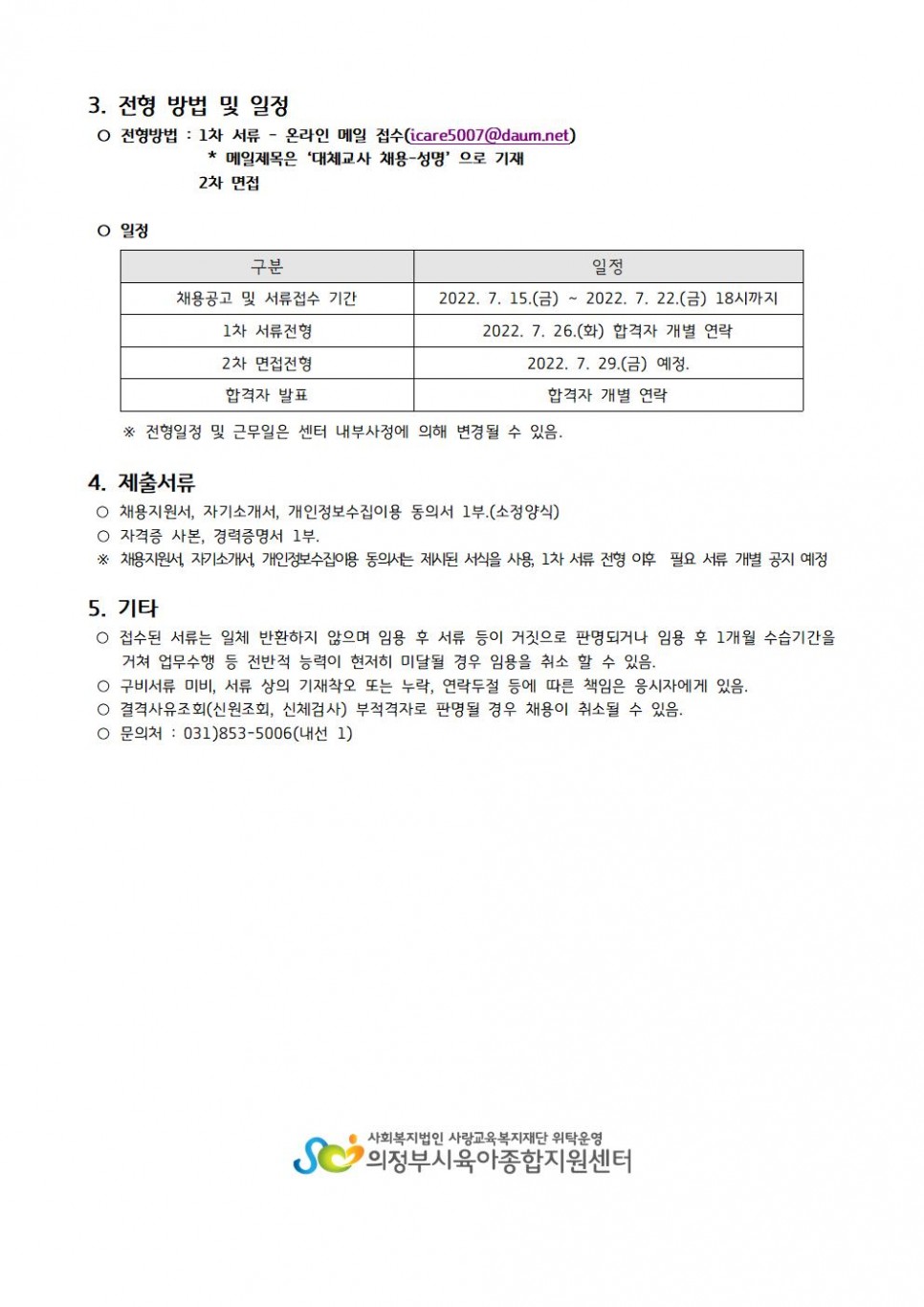 [채용] 의정부시육아종합지원센터 대체교사 채용 재공고 페이지 정보 작성자 의정부센터 댓글 0건 조회 1,714회 작성일 2022-07-14 15:18 첨부파일 첨부 채용지원서, 자기소개서, 개인정보수집이용동의서.hwp (32.0K) 17회 다운로드 | DATE : 2022-07-14 15:18:33 본문 [채용] 의정부시육아종합지원센터 대체교사 채용 재공고 목록 이전글어린이집지원사업 8월 뉴스레터 (2022-06호) 22.07.19 다음글[채용]의정부시육아종합지원센터 직원(운영요원) 채용 재공고 22.07.14