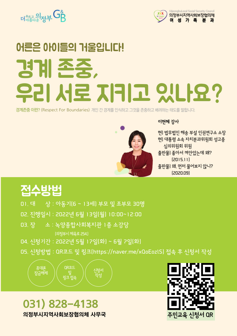 [의정부시지역사회보장협의체] 부모교육 '경계존중, 우리 서로 지키고 있나요?' 페이지 정보 작성자 의정부센터 댓글 0건 조회 1,613회 작성일 2022-05-19 19:38 본문 [의정부시지역사회보장협의체] 부모교육 '경계존중, 우리 서로 지키고 있나요?' 목록 이전글[서초구육아종합지원센터] 어린이집 현장활동 보조인력 채용 재공고 안내 22.05.20 다음글[CJ프레시웨이] 아이누리 자연스럽게 먹자 공모전 22.05.19