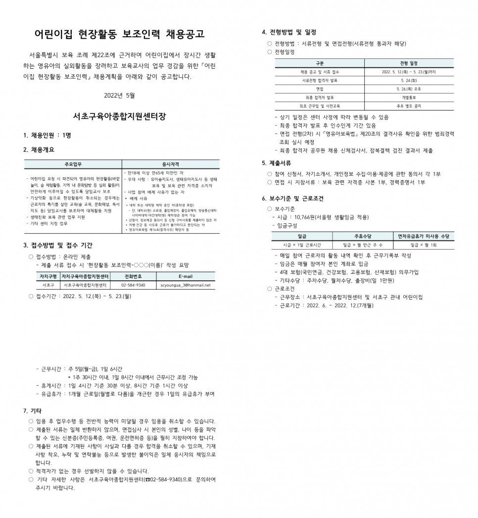 [서초구육아종합지원센터] 어린이집 현장활동 보조인력 채용 재공고 안내