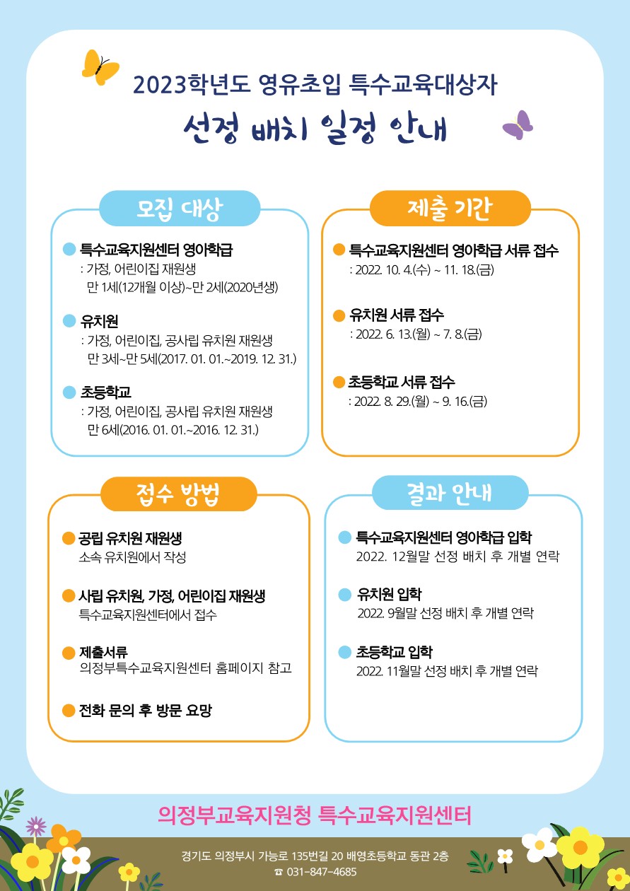 [의정부시특수교육지원센터] 장애영유아의 조기발견 및 의무교육 확대를 위한 리플렛, 포스터 배부 및 게시 요청 페이지 정보 작성자 의정부센터 댓글 0건 조회 2,183회 작성일 2022-05-20 10:29 본문 [의정부시특수교육지원센터] 장애영유아의 조기발견 및 의무교육 확대를 위한 리플렛, 포스터 배부 및 게시 요청 목록 이전글찾아가는 공통부모교육 (7월) 신청 안내 22.05.24 다음글[서초구육아종합지원센터] 어린이집 현장활동 보조인력 채용 재공고 안내 22.05.20