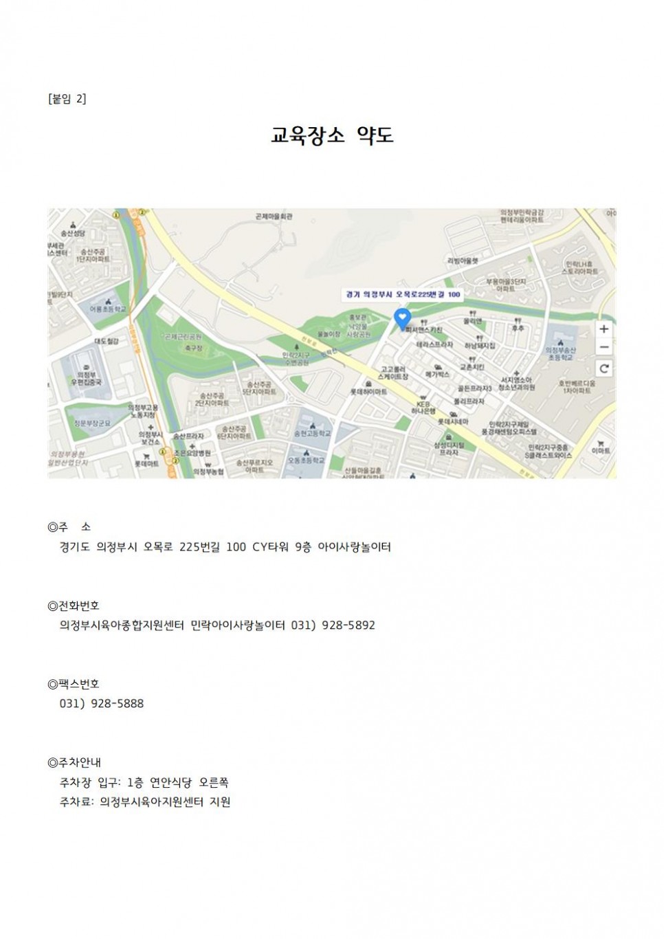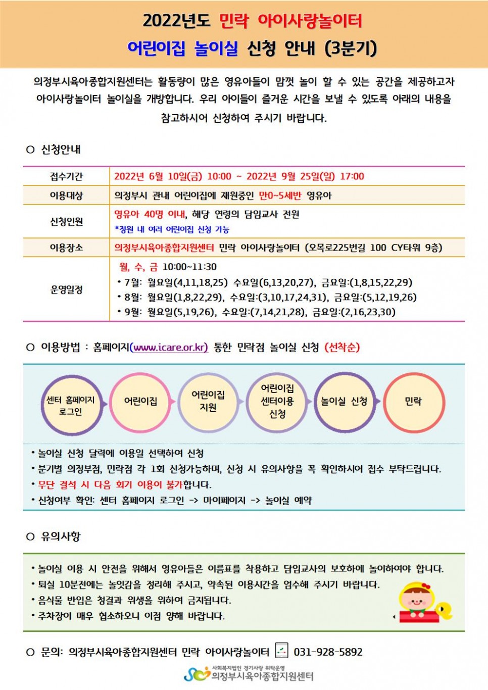 (민락) 2022년 3분기(7~9월) 어린이집 놀이실 신청 안내 페이지 정보 작성자 의정부센터 댓글 0건 조회 1,531회 작성일 2022-05-31 10:39 본문 놀이실 지점을 꼭 확인하시고 신청부탁드립니다.(아래 지도 첨부하였습니다.) 목록 이전글(의정부) 2022년 3분기(7~9월) 어린이집 놀이실 신청 안내 22.05.31 다음글찾아가는 공통부모교육 7월 (양육스트레스관리 부모교육) 안내 22.05.24