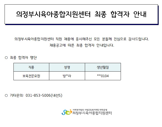 의정부시육아종합지원센터 직원(보육전문요원) 최종 합격자 발표 페이지 정보 작성자 의정부센터 댓글 0건 조회 1,705회 작성일 2022-04-14 17:14 본문 의정부시육아종합지원센터 직원(보육전문요원) 최종 합격자 발표 목록 이전글[경기북부보육교사교육원] 2022년 영아보육전문교육(심화과정) 모집안내 22.04.21 다음글의정부시육아종합지원센터 직원(놀이지도사) 채용 공고 22.04.13