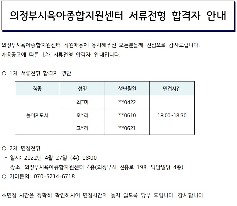 의정부시육아종합지원센터 직원(놀이지도사) 서류전형 합격자 발표 페이지 정보 작성자 의정부센터 댓글 0건 조회 1,564회 작성일 2022-04-26 10:17 본문 의정부시육아종합지원센터 직원(놀이지도사) 서류전형 합격자 발표 목록 이전글2022년 '찾아가는 공통부모교육' (6월) 신청 안내 22.04.26 다음글2022년 5월 어린이집지원사업 뉴스레터 (2022-03호) 22.04.22