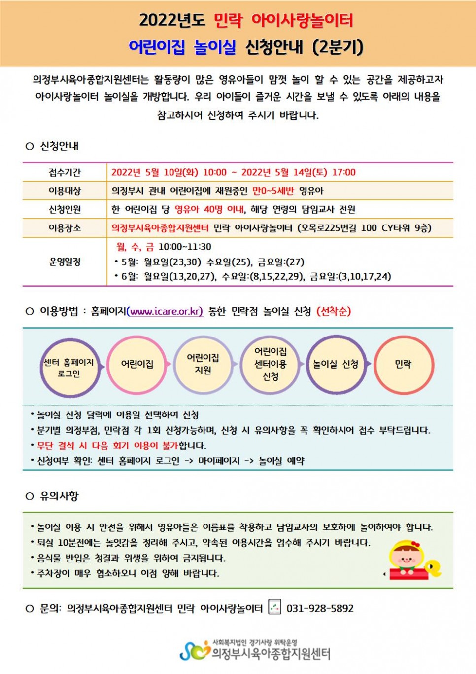 (민락) 2022년 어린이집 놀이실 신청 안내 페이지 정보 작성자 의정부센터 댓글 0건 조회 1,548회 작성일 2022-05-03 10:43 본문 (민락) 2022년 어린이집 놀이실 신청 안내 목록 이전글(의정부) 2022년 어린이집 놀이실 신청 안내 22.05.03 다음글의정부시육아종합지원센터 직원(놀이지도사) 최종 합격자 발표 22.04.28