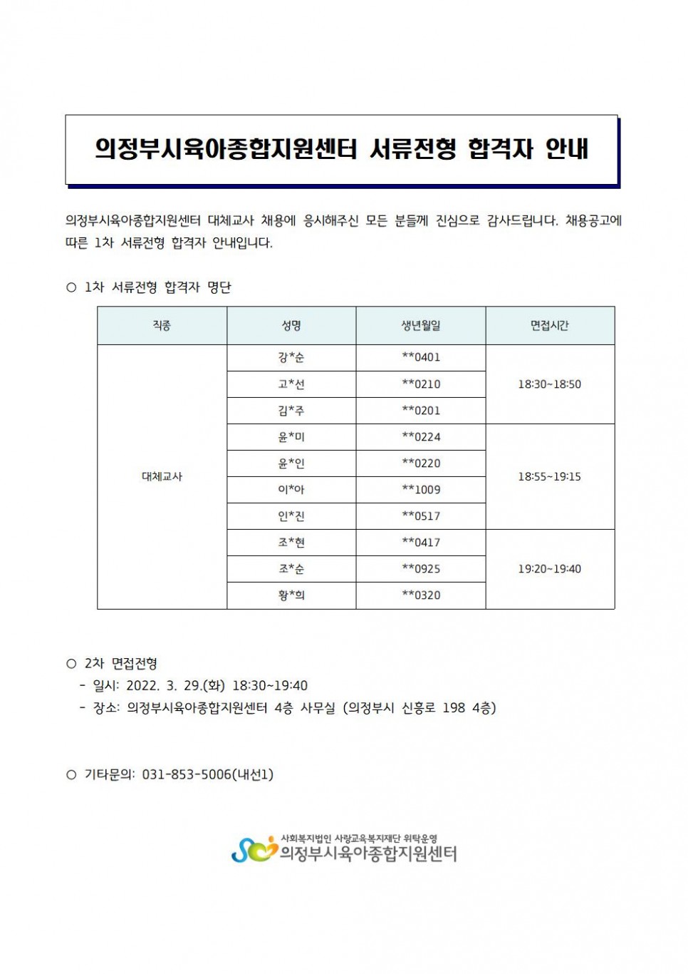 의정부시육아종합지원센터 대체교사 서류전형 합격자발표 페이지 정보 작성자 의정부센터 댓글 0건 조회 1,949회 작성일 2022-03-22 09:22 본문 의정부시육아종합지원센터 대체교사 서류전형 합격자발표 목록 이전글코로나-19 재택치료 소아를 위한 보호자용 Q&A 안내 22.03.24 다음글2022년 어린이집지원 뉴스레터 (2022-02호) 22.03.21