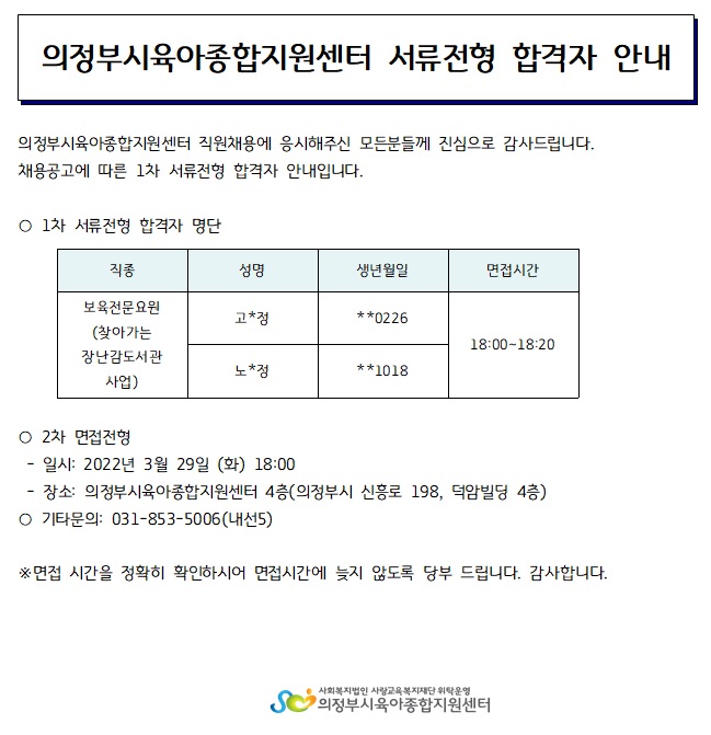 의정부시육아종합지원센터 보육전문요원(찾아가는 장난감도서관 사업)서류전형 합격자 안내