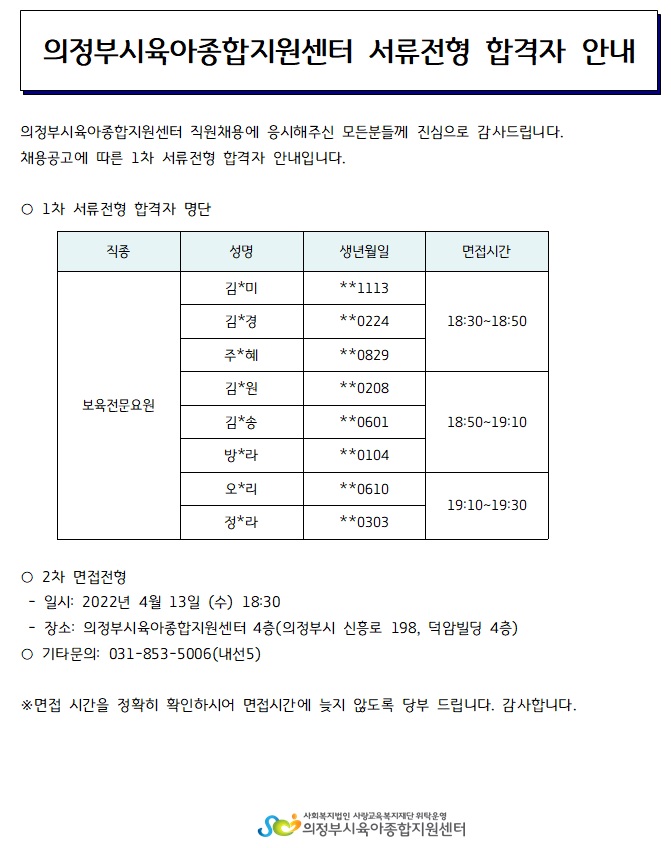 의정부시육아종합지원센터 직원(보육전문요원) 채용 서류전형 합격자 안내 페이지 정보 작성자 의정부센터 댓글 0건 조회 1,794회 작성일 2022-04-11 14:22 본문 의정부시육아종합지원센터 직원(보육전문요원) 채용 서류전형 합격자 안내 목록 이전글의정부시육아종합지원센터 직원(놀이지도사) 채용 공고 22.04.13 다음글2022년 '찾아가는 공통부모교육' (5월) 신청 안내 22.04.07
