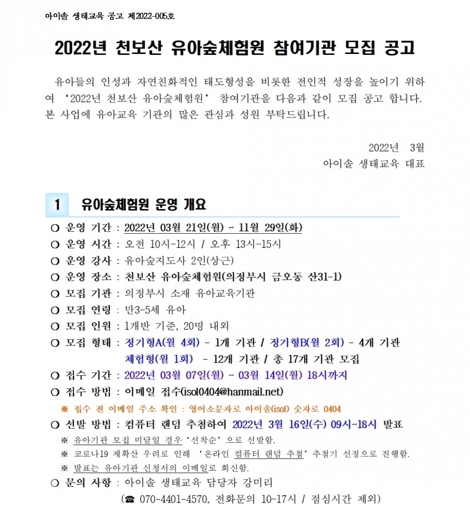 [아이솔생태교육] 2022년 천보산 유아숲체험원 참여기관 모집 > 공지사항