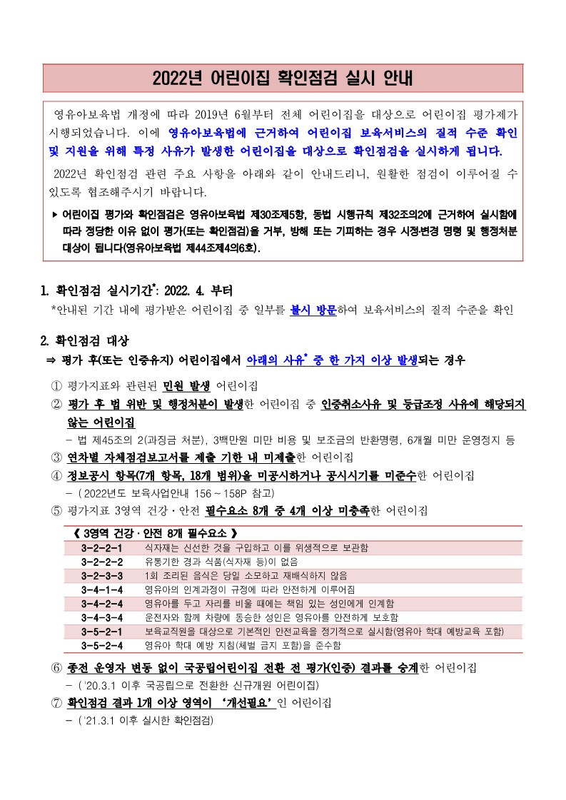 2022년 어린이집 확인점검 실시 안내 협조요청 페이지 정보 작성자 의정부센터 댓글 0건 조회 2,027회 작성일 2022-03-11 16:41 본문 2022년 어린이집 확인점검 실시 안내 협조요청 목록 이전글2022년 의정부시 부모모니터링단원 모집 공고 22.03.16 다음글의정부시육아종합지원센터 대체교사 서류전형 합격자발표 22.02.22