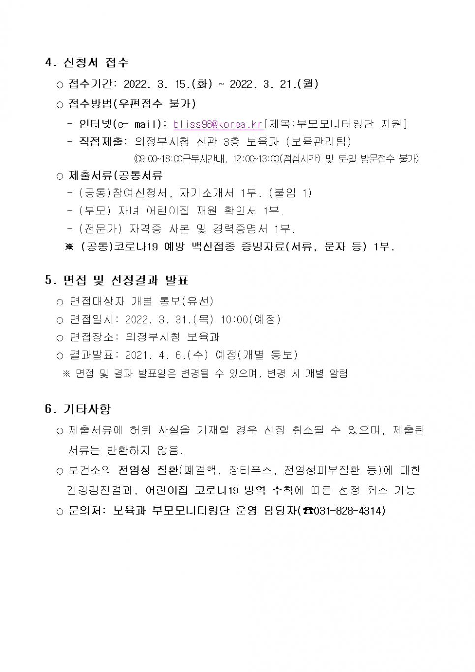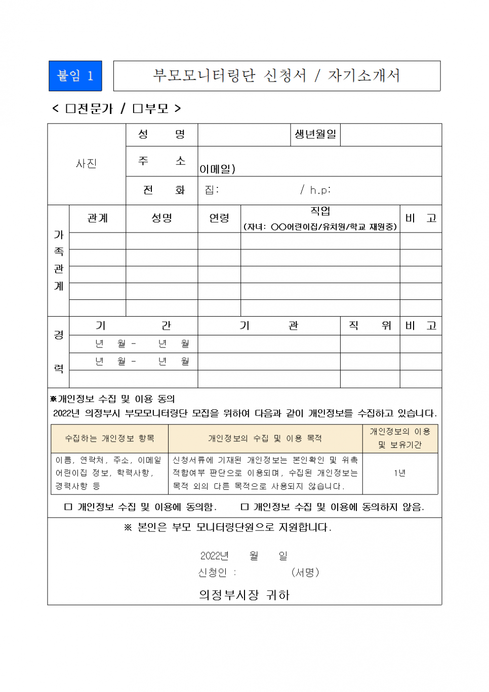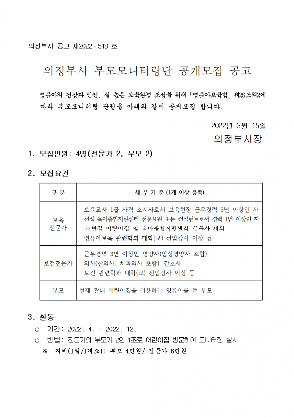 「영유아보육법」제25조의2에 따라 2022년 의정부시 부모모니터링 단원을 다음과 같이 공개모집 합니다.