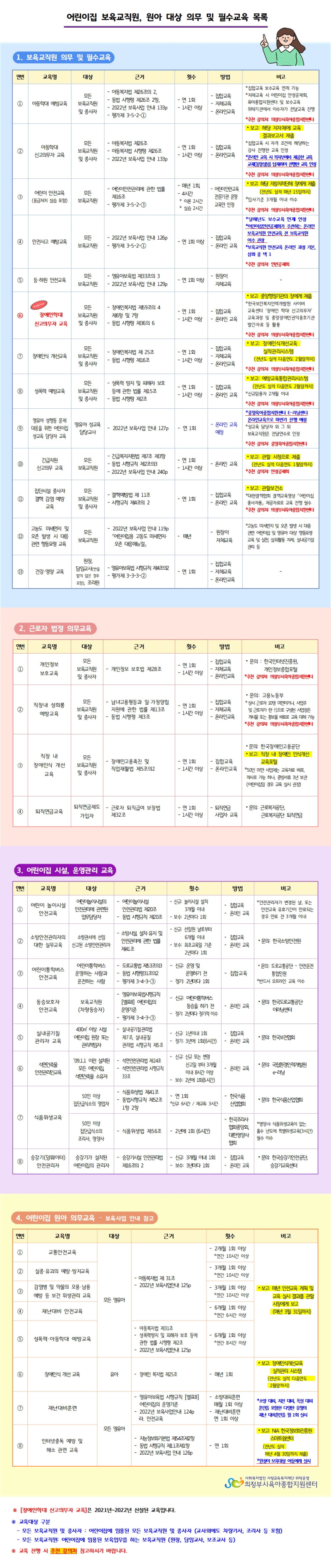2022년 어린이집 보육교직원, 원아 대상 의무 및 필수교육 목록 (22. 2. 18 기준)