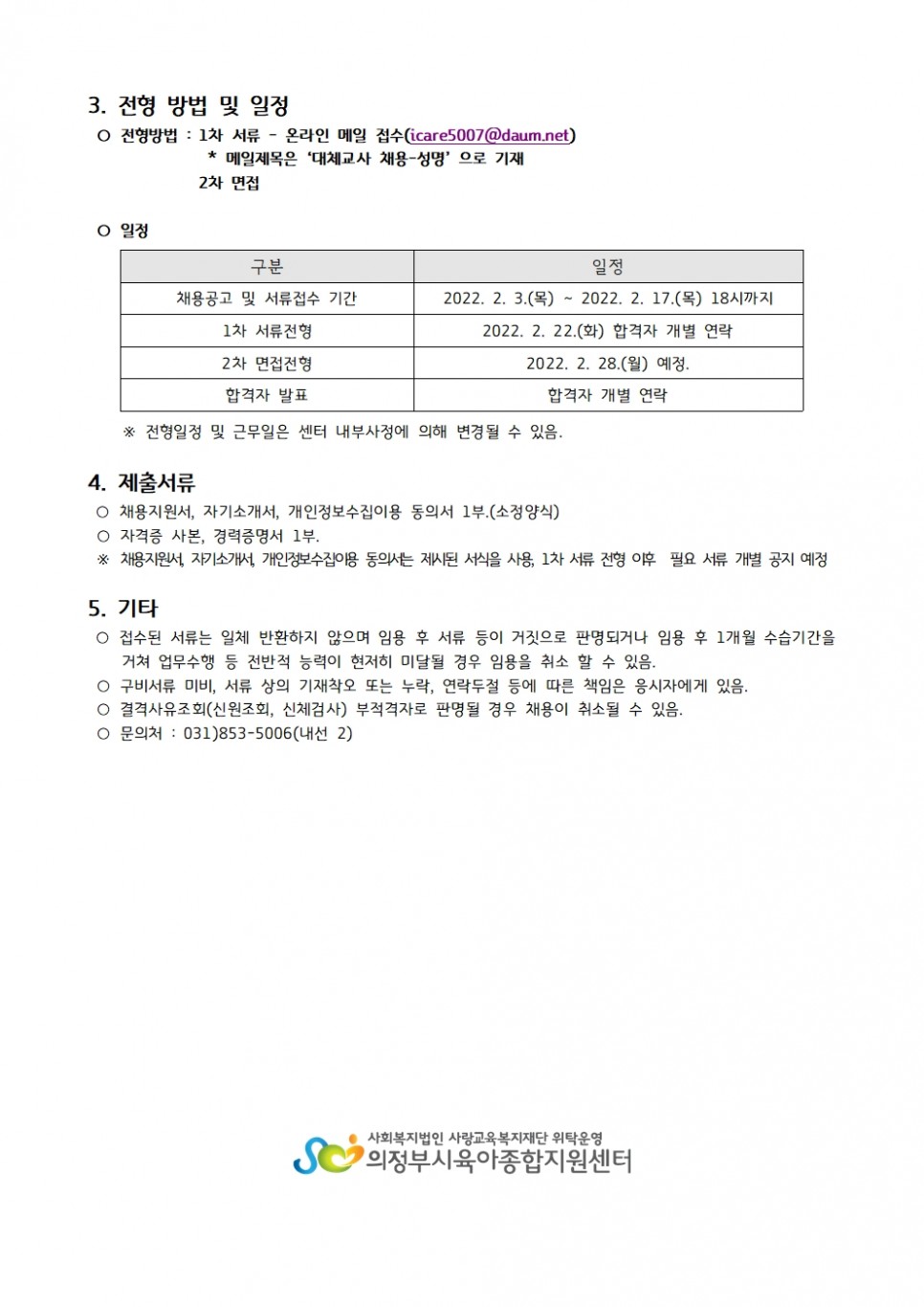 의정부시육아종합지원센터 2022년 대체교사 채용 공고 페이지 정보 작성자 의정부센터 댓글 0건 조회 1,847회 작성일 2022-02-03 14:26 첨부파일 첨부채용지원서,자기소개서,개인정보수집이용동의서.hwp (32.0K) 8회 다운로드 | DATE : 2022-02-03 14:27:17 본문 의정부시육아종합지원센터 2022년 대체교사 채용 공고 목록 이전글의정부시육아종합지원센터 대체교사 서류전형 합격자발표 22.02.22 다음글[아이솔생태교육] 2022년 천보산 유아숲체험원 참여기관 모집 22.03.11