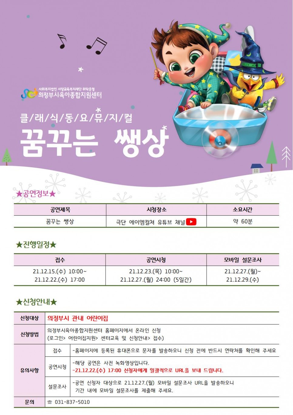 클래식 동요뮤지컬 '꿈꾸는 쌩상' 안내 (어린이집 대상 신청) 페이지 정보 작성자 의정부센터 댓글 0건 조회 2,455회 작성일 2021-12-10 11:48 본문 클래식 동요뮤지컬 '꿈꾸는 쌩상' 안내 (어린이집 대상 신청) 목록 이전글[의정부시육아종합지원센터] 2022년 일급형 대체교사 인력풀 채용공고 22.01.05 다음글육아정보지 신청 안내(겨울호) 21.12.02