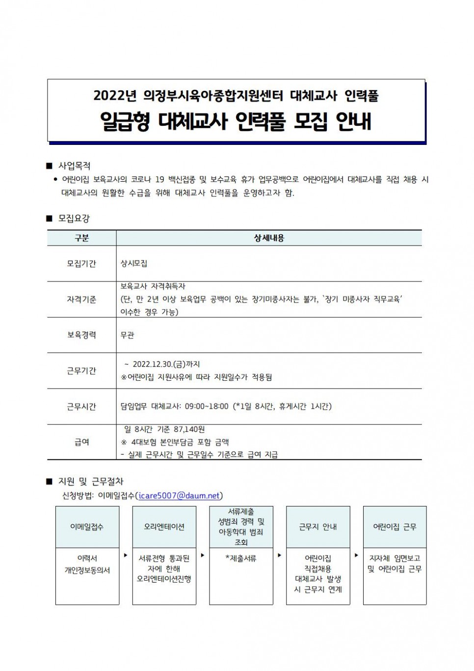 [의정부시육아종합지원센터] 2022년 일급형 대체교사 인력풀 채용공고