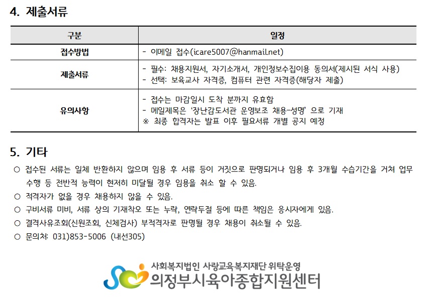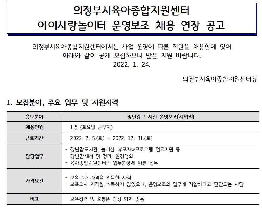 [채용]의정부시육아종합지원센터 아이사랑놀이터 운영보조 채용 연장 공고
