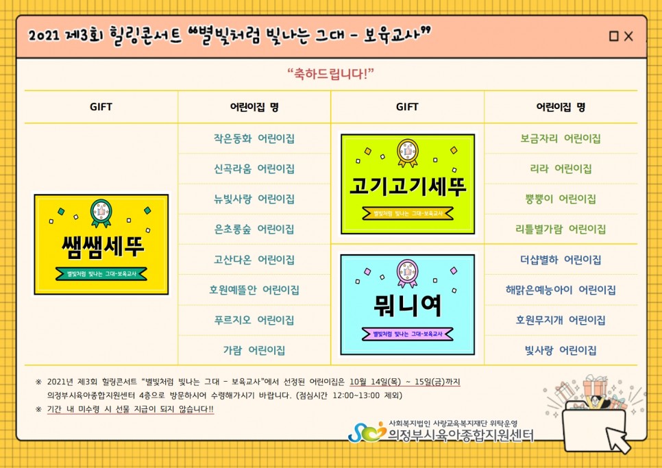 2021 의정부시 보육교직원 힐링콘서트 '제3회 별빛처럼 빛나는 그대-보육교사' 선물 증정 명단 안내