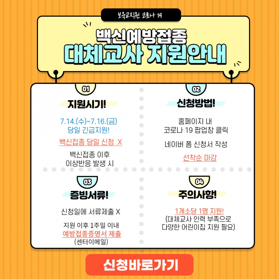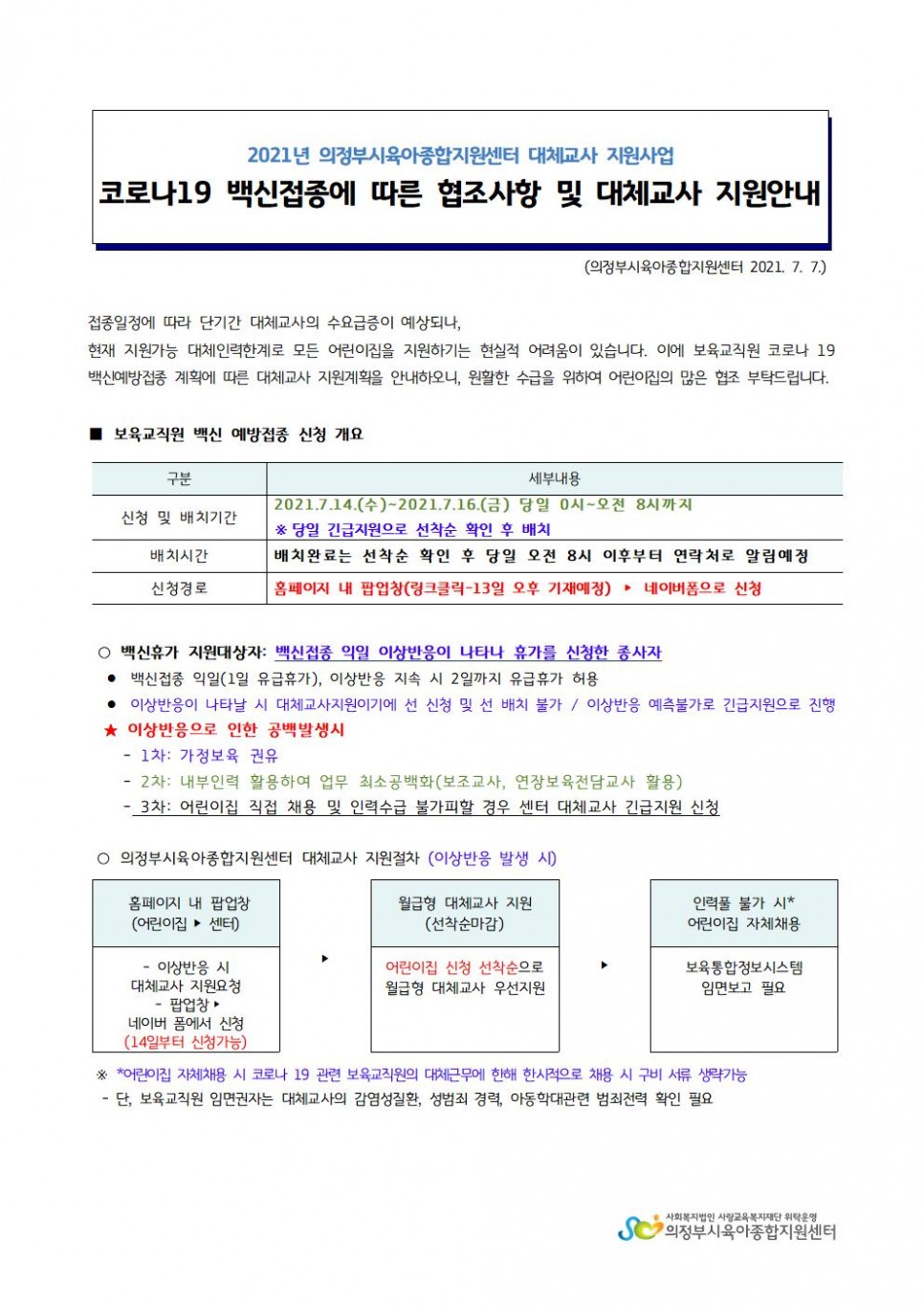 [의정부시육아종합지원센터] 30세 이상 코로나 19 백신접종에 따른 협조사항 및 대체교사 지원안내입니다. 페이지 정보 작성자 의정부센터 댓글 0건 조회 2,106회 작성일 2021-07-08 14:57 본문 링크 주소: http://naver.me/x9JOQZPQ 목록 이전글코로나바이러스감염증-19 유행대비 어린이집용 대응지침(Ⅷ-1판) 21.07.09 다음글제7회 도담아이 사진 공모전 수상작 안내 21.07.07