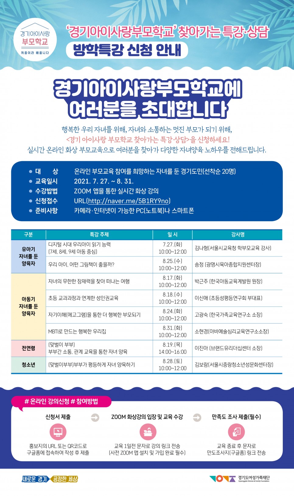 2021 [경기아이사랑 부모학교 찾아가는 특강, 상담] 방학특강 참여자 모집 홍보 요청