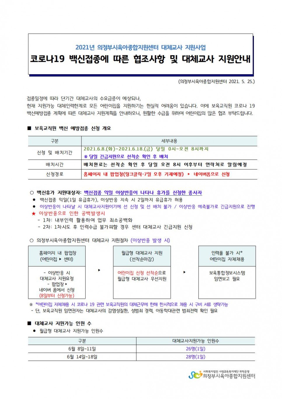[의정부시육아종합지원센터] 2021년 코로나 19백신접종에 따른 협조사항 및 대체교사 지원안내 페이지 정보 작성자 의정부센터 댓글 0건 조회 2,371회 작성일 2021-06-02 13:21 본문 신청주소: http://naver.me/x9JOQZPQ 목록 이전글「경기도 영유아 발달지원 서비스」 발달지연 시 찾아갈 수 있는 관내 의료기관 안내 21.06.02 다음글2021년 육아정보지 신청 안내 21.06.01