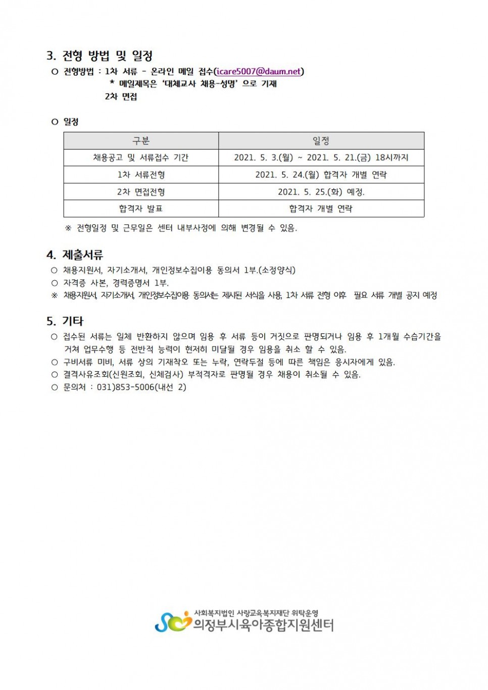 의정부시육아종합지원센터 2021년도 대체교사 채용 연장공고 페이지 정보 작성자 의정부센터 댓글 0건 조회 2,209회 작성일 2021-05-11 10:39 첨부파일 첨부 채용지원서, 자기소개서, 개인정보수집이용동의서.hwp (32.0K) 40회 다운로드 | DATE : 2021-05-11 10:39:17 본문 의정부시육아종합지원센터 2021년도 대체교사 채용 연장공고 목록 이전글「경기도 영유아 발달지원 서비스」 - 도담도담 더하기 신청 안내 21.05.17 다음글2021년 열린어린이집 현장 컨설팅 일정 안내 21.05.11