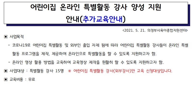 어린이집 온라인 특별활동 강사 양성 지원 안내(추가교육안내) 페이지 정보 작성자 의정부센터 댓글 0건 조회 2,739회 작성일 2021-05-21 16:03 첨부파일 강의 신청서.hwp (40.0K) 22회 다운로드 | DATE : 2021-05-21 16:03:49 본문 어린이집 온라인 특별활동 강사 양성 지원 안내(추가교육안내) 목록 이전글온라인 음악회 '꿈과 환상의 뮤직쇼' 21.05.22 다음글2021년 찾아가는 유아 흡연위해예방교실 안내 21.05.18