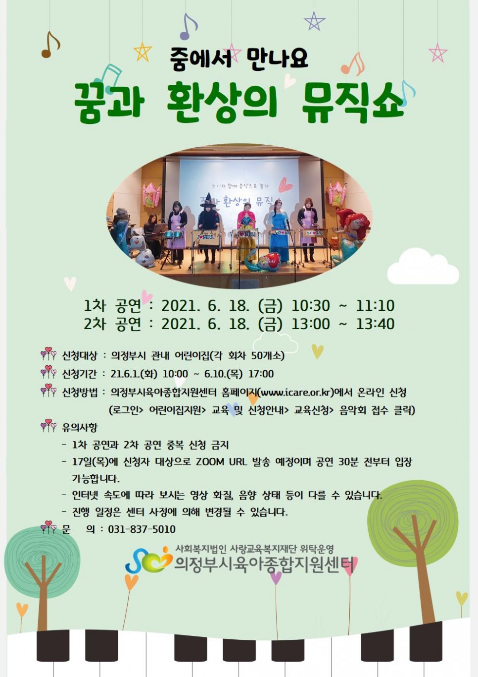 온라인 음악회 '꿈과 환상의 뮤직쇼' 페이지 정보 작성자 의정부센터 댓글 0건 조회 2,581회 작성일 2021-05-22 11:14 본문 실시간 줌 공연으로 신청하신 어린이집에 ZOOM URL을 보내드립니다.자세한 사항은 안내문을 참조하시기 바라며 궁금하신 점은 전화로 문의해주세요. 목록 이전글의정부시육아종합지원센터 대체교사 서류전형 합격자발표 21.05.24 다음글어린이집 온라인 특별활동 강사 양성 지원 안내(추가교육안내) 21.05.21