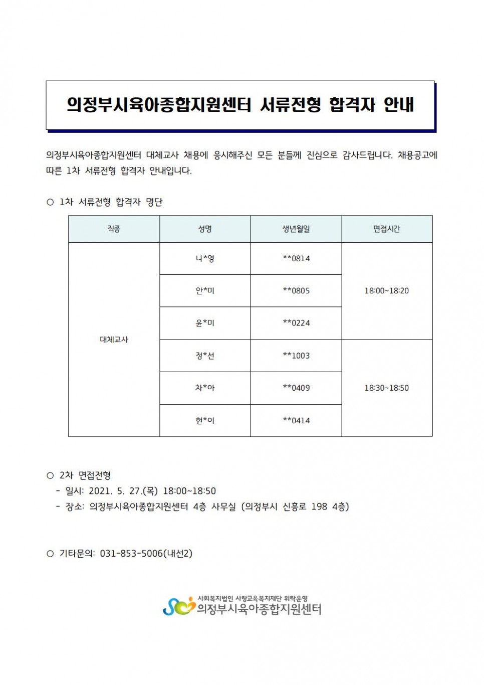 의정부시육아종합지원센터 대체교사 서류전형 합격자발표 페이지 정보 작성자 의정부센터 댓글 0건 조회 2,125회 작성일 2021-05-24 15:26 본문 의정부시육아종합지원센터 대체교사 서류전형 합격자발표 목록 이전글의정부시육아종합지원센터 2021년도 대체교사 최종합격자 안내 21.05.27 다음글온라인 음악회 '꿈과 환상의 뮤직쇼' 21.05.22