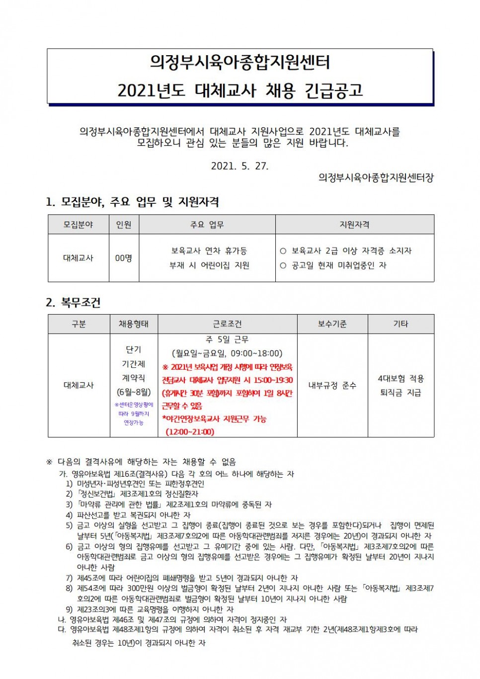 의정부시육아종합지원센터 대체교사 채용 긴급공고