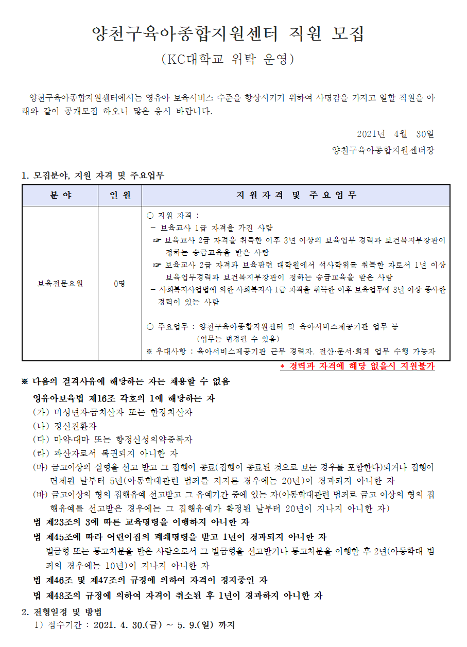 양천구육아종합지원센터 직원 채용(보육전문요원) 공고