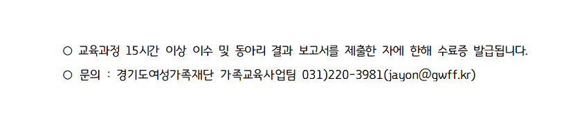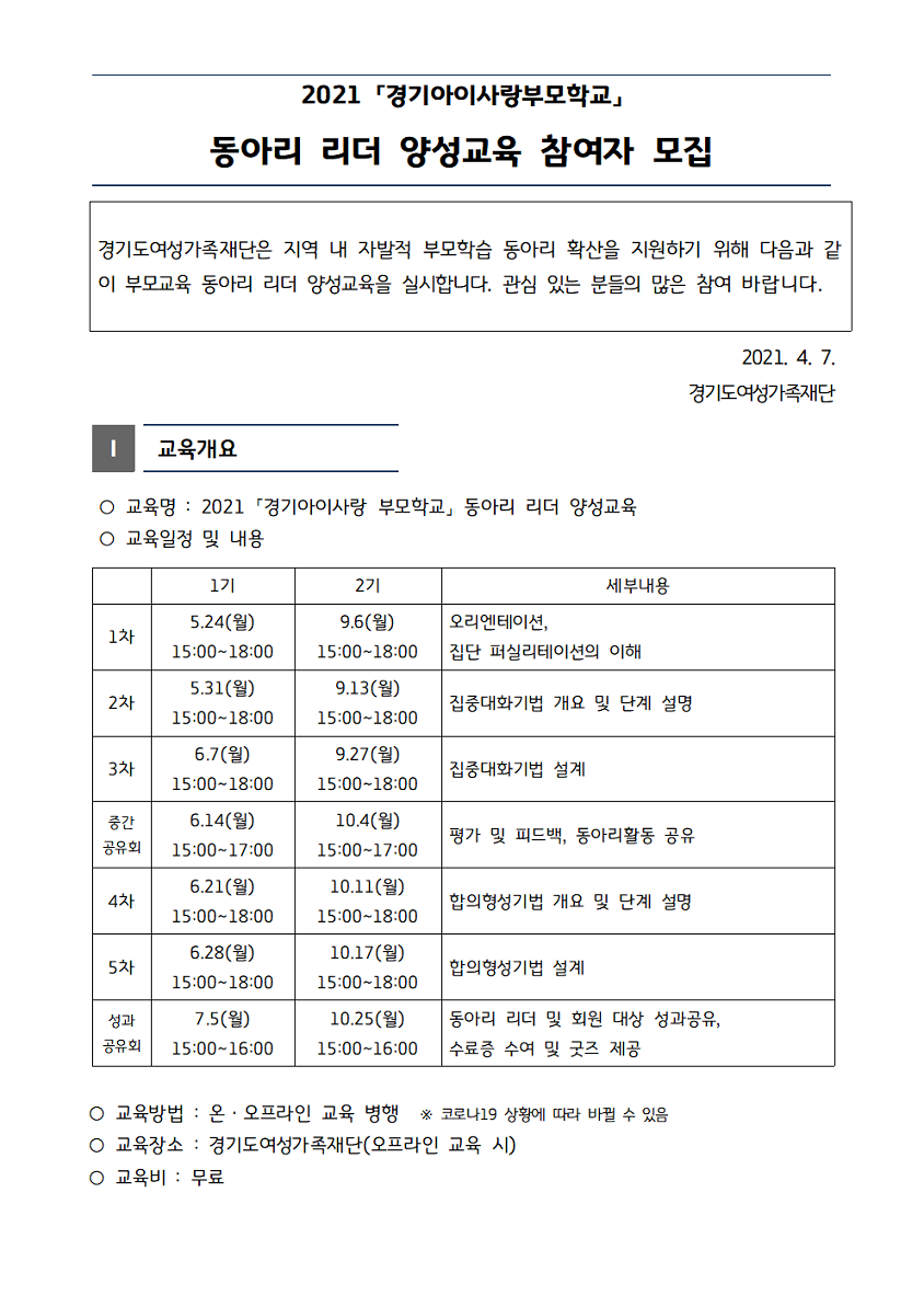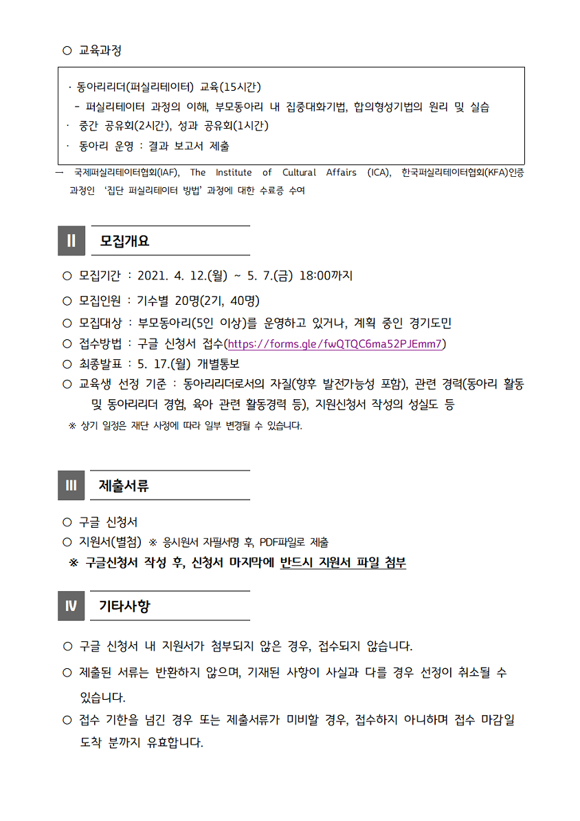 2021 경기아이사랑 부모학교 동아리리더 양성교육 참여자 모집 및 홍보요청 페이지 정보 작성자 의정부센터 댓글 0건 조회 2,465회 작성일 2021-05-04 09:39 첨부파일 첨부2_지원서.hwp (19.0K) 15회 다운로드 | DATE : 2021-05-04 09:39:35 본문 2021 경기아이사랑 부모학교 동아리리더 양성교육 참여자 모집 및 홍보요청 목록 이전글「경기도 영유아 발달지원 서비스」 사업 안내 영상 21.05.04 다음글양천구육아종합지원센터 직원 채용(보육전문요원) 공고 21.05.04