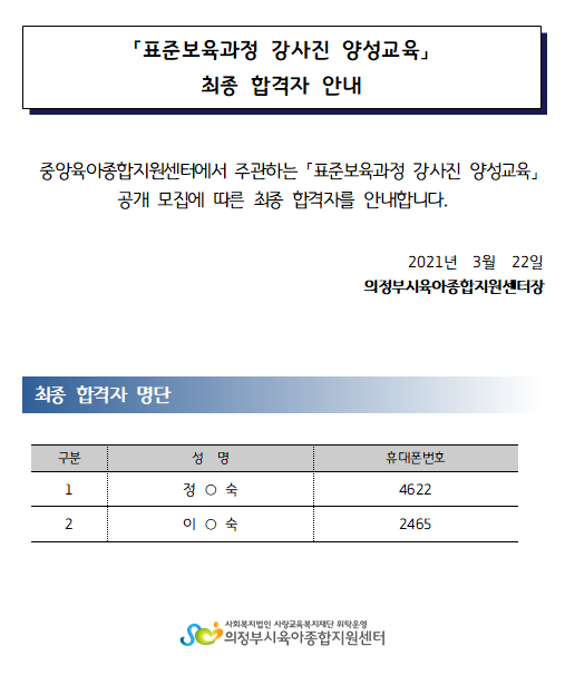 중앙육아종합지원센터 「표준보육과정 강사진 양성교육」 최종 합격자 > 공지사항