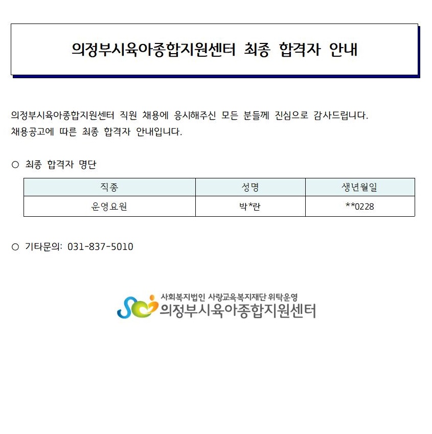 의정부시육아종합지원센터 직원(운영요원) 최종 합격자발표 > 공지사항