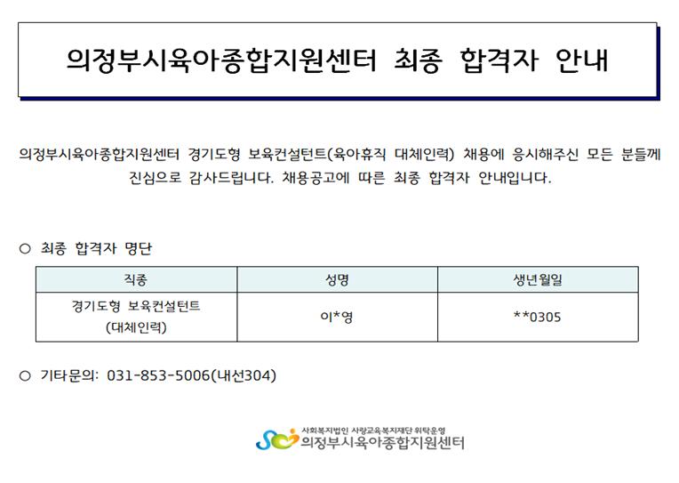 의정부시육아종합지원센터 직원(경기도형 보육컨설턴트-육아휴직 대체인력) 최종 합격자 안내 페이지 정보 작성자 의정부센터 댓글 0건 조회 3,249회 작성일 2021-02-16 10:41 본문 의정부시육아종합지원센터 직원(경기도형 보육컨설턴트-육아휴직 대체인력) 최종 합격자 안내 목록 이전글[연간계획안]2021년 어린이집 지원사업, 가정양육 지원사업 연간일정 21.02.17 다음글의정부시육아종합지원센터 직원(보육전문요원) 채용 공고 21.02.15