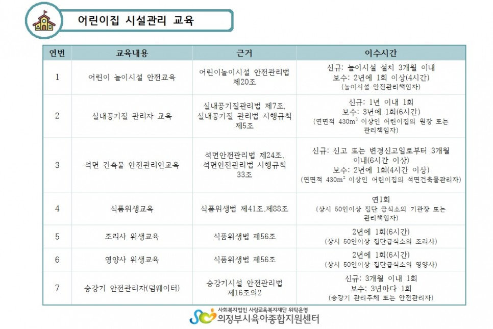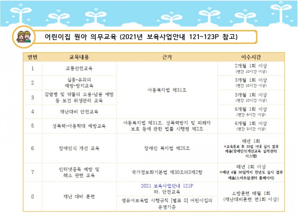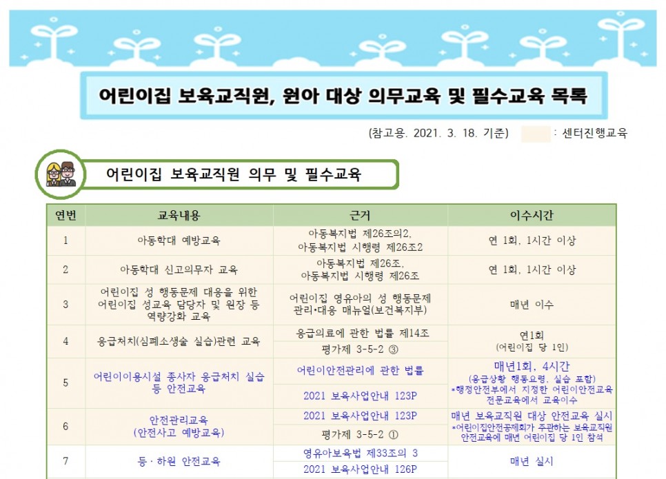 어린이집 보육교직원 ,원아 의무교육 및 필수교육 항목(2021.03.18.)