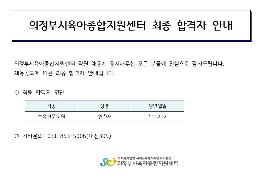 의정부시육아종합지원센터 직원(보육전문요원) 최종 합격자발표