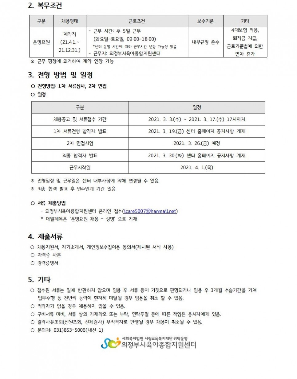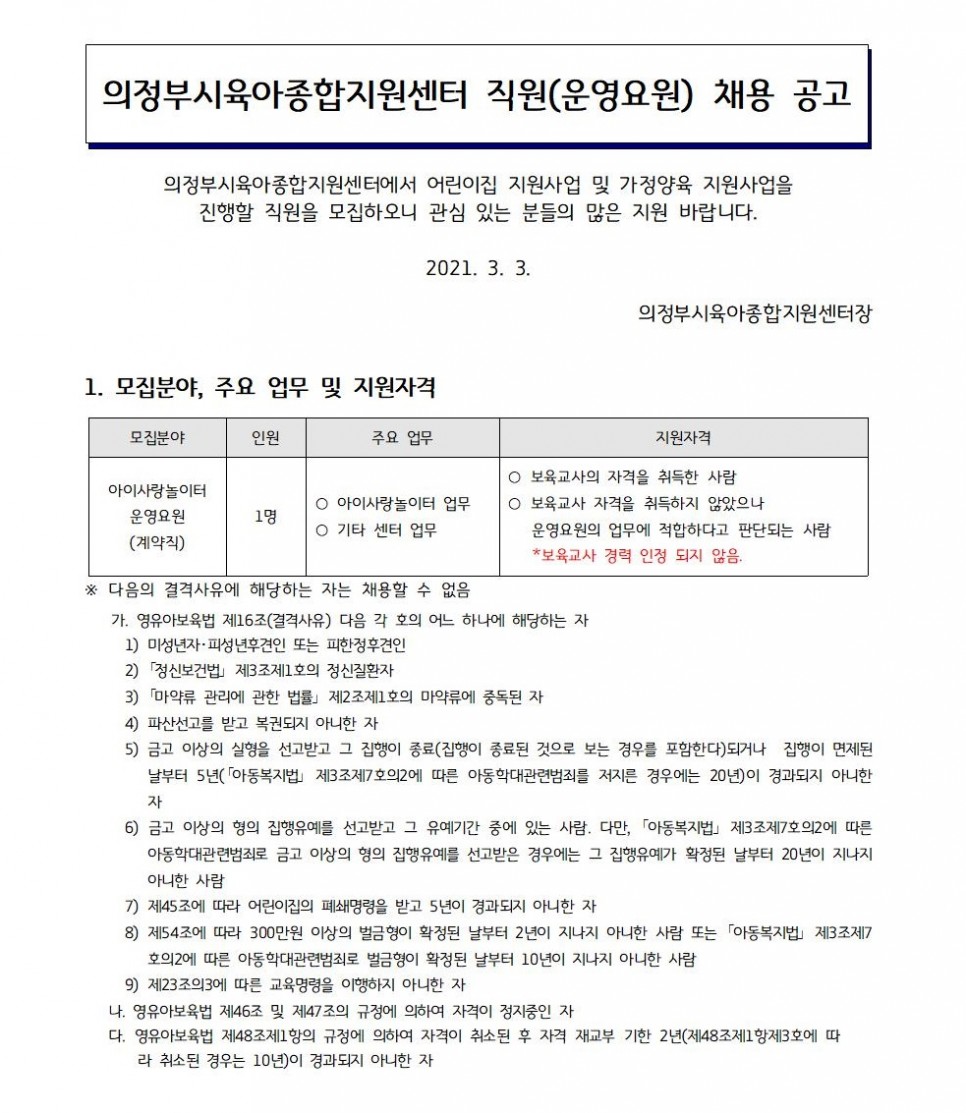 의정부시육아종합지원센터 직원(운영요원) 채용 공고