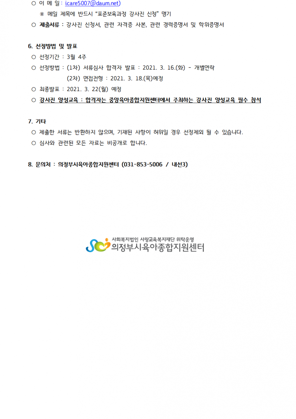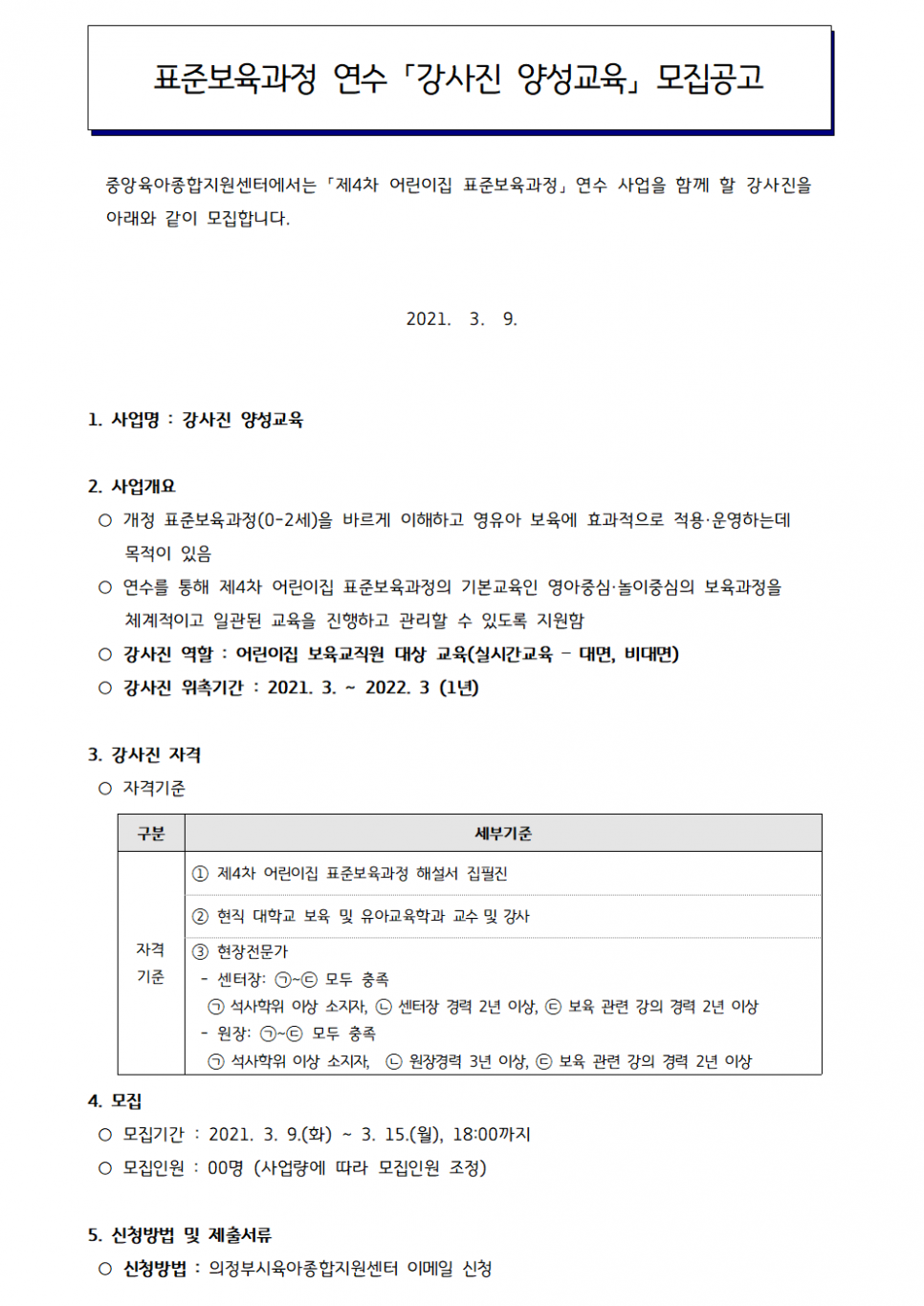 표준보육과정 강사진 양성교육 모집 공고 페이지 정보 작성자 의정부센터 댓글 0건 조회 2,890회 작성일 2021-03-09 10:33 첨부파일 붙임. 신청서 양식 및 개인정보 동의서.hwp (32.0K) 40회 다운로드 | DATE : 2021-03-09 10:33:26 본문 * 신청서 작성 시 글씨체는 '경기천년체'로 작성해주시기 바랍니다. 목록 이전글어린이집「부모모니터링단」공개모집 공고 21.03.10 다음글2021년도 보육교직원 온라인 보수교육 위탁기관 선정 결과 공고 21.03.08