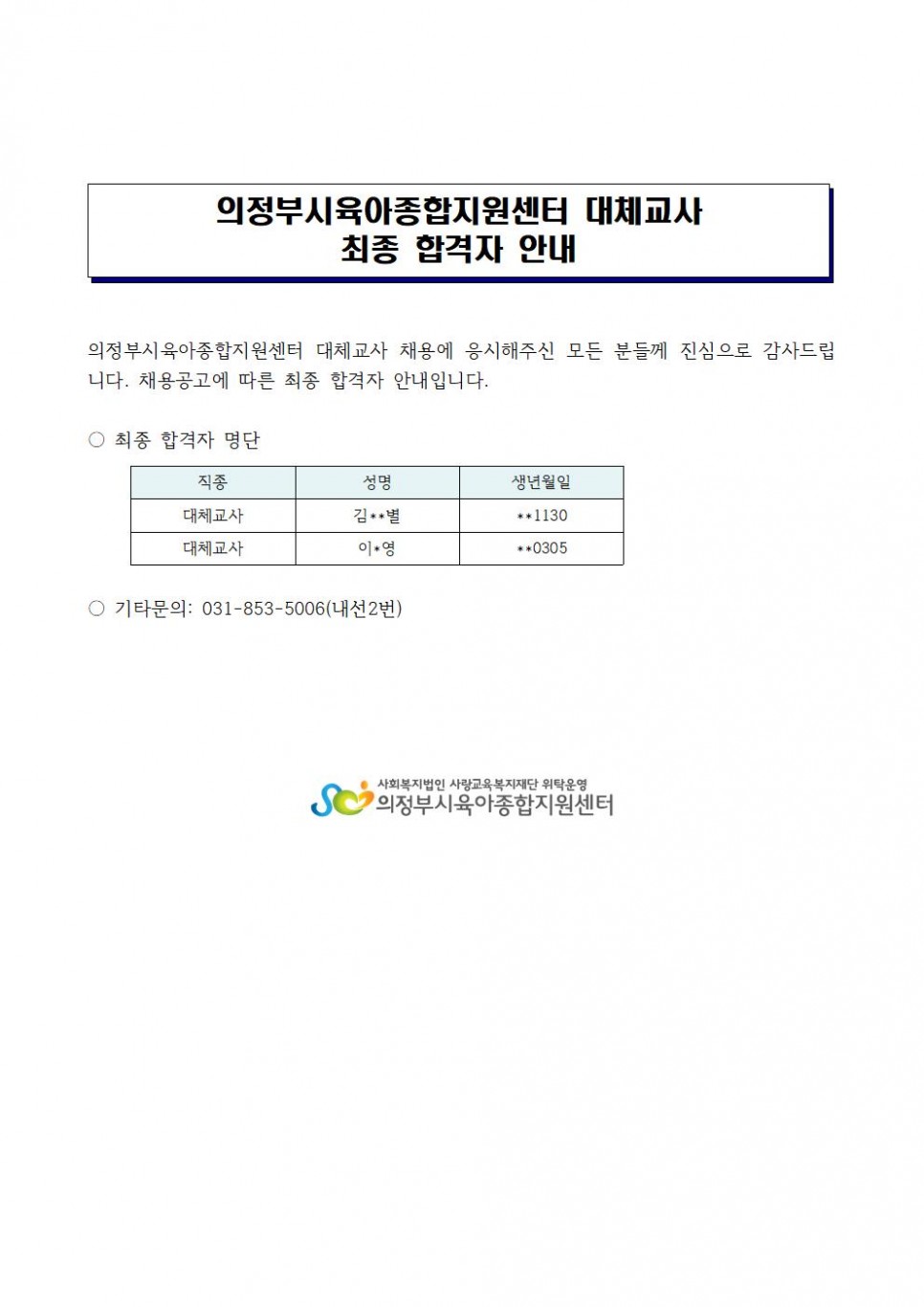 의정부시육아종합지원센터 최종 합격자 발표(대체교사) 페이지 정보 작성자 의정부센터 댓글 0건 조회 3,060회 작성일 2020-12-21 09:07 본문 의정부시육아종합지원센터 최종 합격자 발표(대체교사) 목록 이전글서류 전형 합격자 발표(운영보조) 20.12.29 다음글크리스마스행사 '온라인 마술공연' 20.12.19