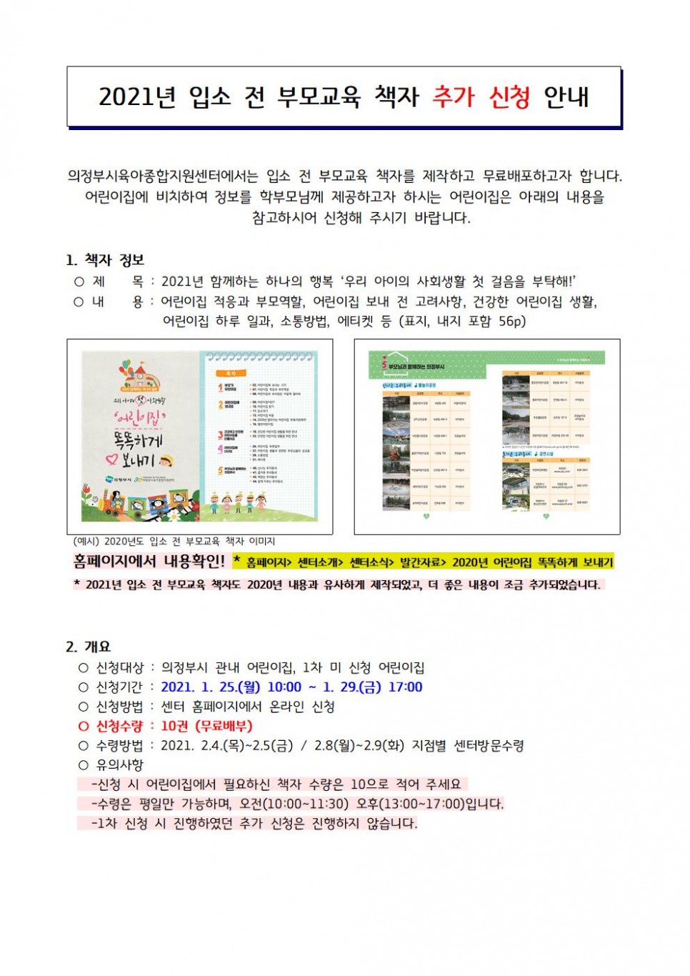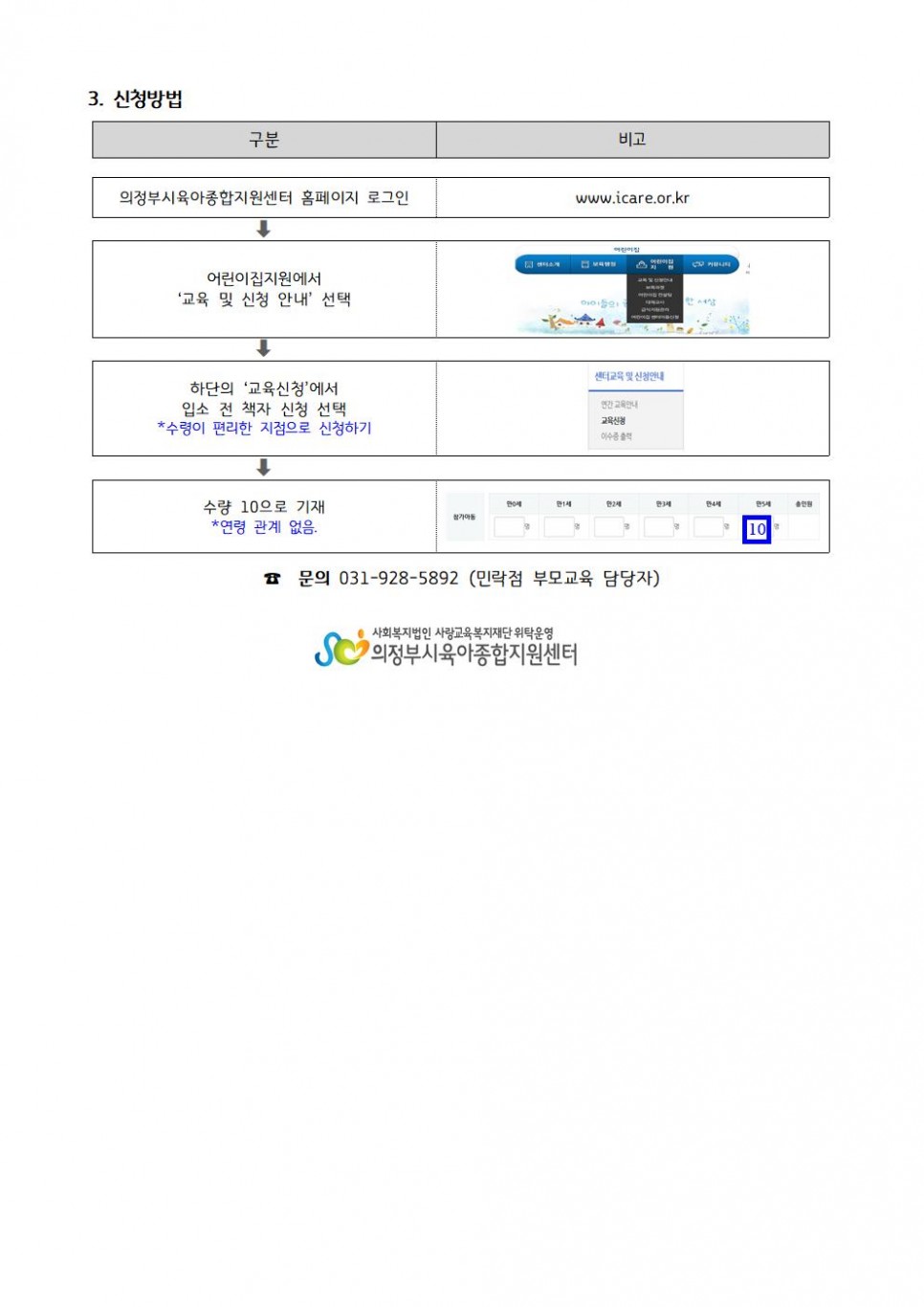 입소 전 부모교육 책자 추가 신청 안내 페이지 정보 작성자 의정부센터 댓글 0건 조회 3,260회 작성일 2021-01-22 16:48 본문 1차 미 신청 어린이집 대상으로 보육통합시스템 업무연락으로 공문과 안내문 전송하였습니다. 확인 후 신청바랍니다. 목록 이전글의정부시육아종합지원센터 직원(상담지원인력) 서류전형 합격자 안내 21.01.25 다음글2020년 의정부시육아종합지원센터 예산결산 내역 공고 21.01.21
