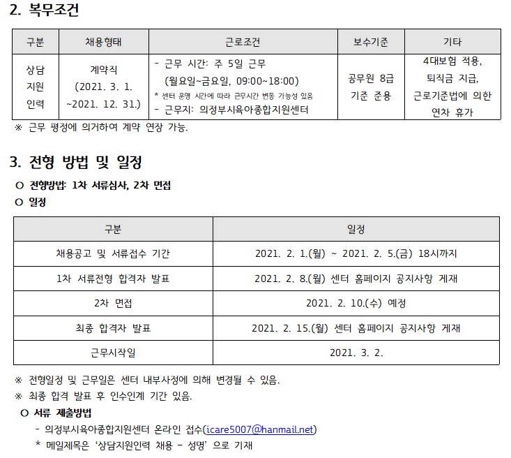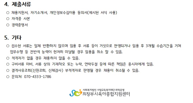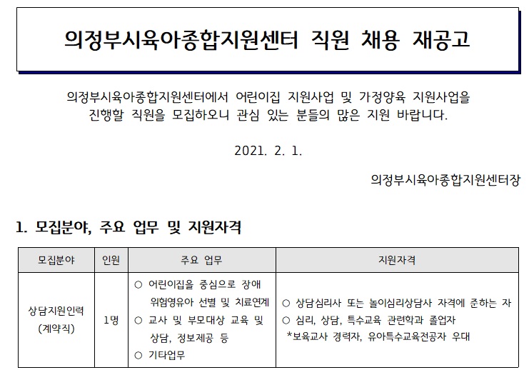 의정부시육아종합지원센터 직원(상담지원인력) 채용 재공고 페이지 정보 작성자 의정부센터 댓글 0건 조회 3,170회 작성일 2021-02-01 10:19 첨부파일 첨부 채용지원서, 자기소개서, 개인정보수집이용동의서.hwp (32.0K) 41회 다운로드 | DATE : 2021-02-01 10:19:39 본문 의정부시육아종합지원센터 직원(상담지원인력) 채용 재공고 목록 이전글경기도 아빠하이 참여자 모집 21.02.01 다음글의정부시육아종합지원센터 직원(경기도형 보육컨설턴트 대체인력) 채용 공고 21.02.01