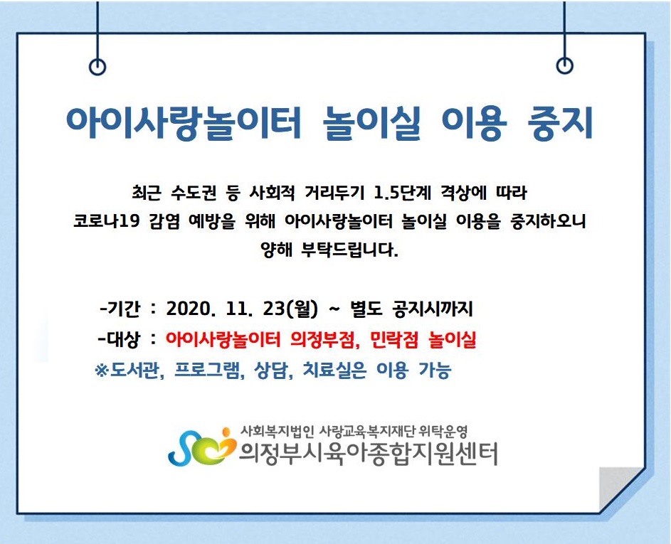 아이사랑놀이터 놀이실 이용 중지 안내(20.11.23.(월)~ 별도 공지시까지)