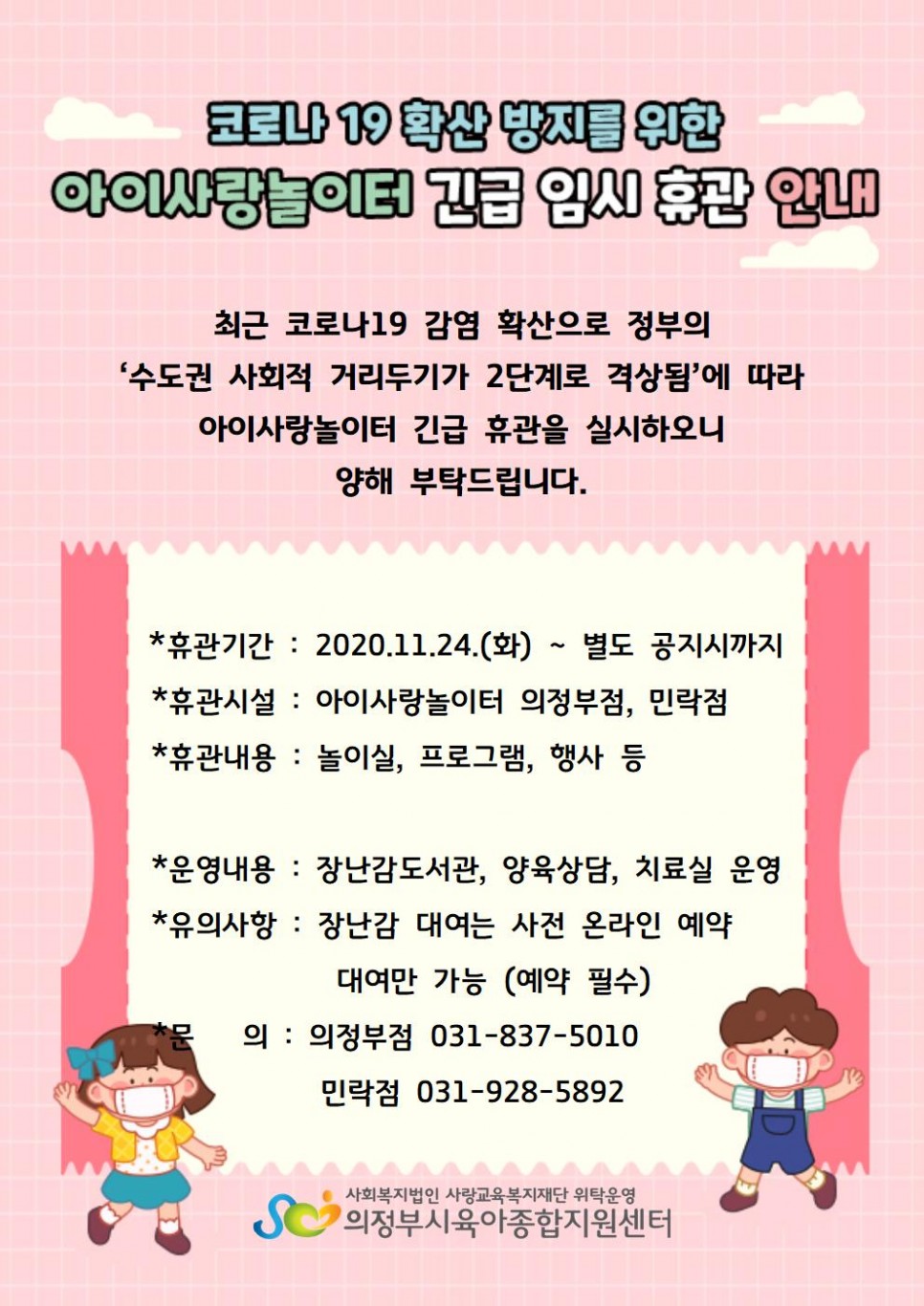 아이사랑놀이터 휴관 안내_20.11.24.(화)~ 별도 공지시까지 > 공지사항