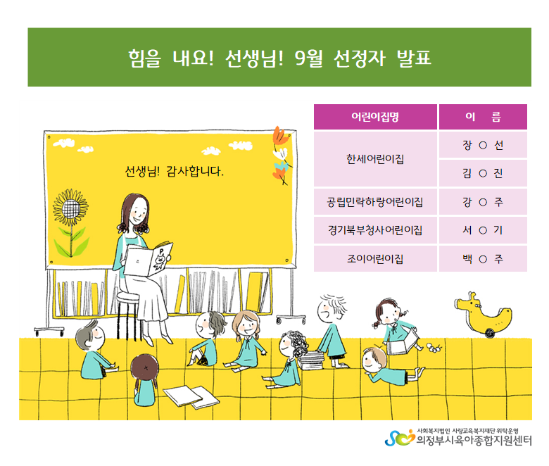 보육교직원 직무스트레스 완화 '힘을 내요! 선생님!' 9월 선정자 발표