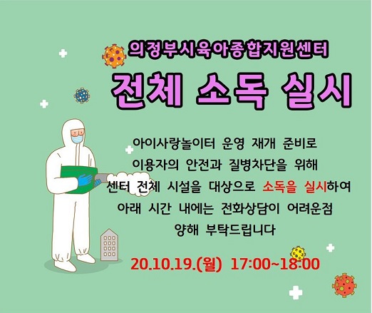 의정부시육아종합지원센터 전체 소독 실시 (2020.10.19.(월) 17:00~18:00) 페이지 정보 작성자 의정부센터 댓글 0건 조회 2,515회 작성일 2020-10-19 10:06 본문 의정부시육아종합지원센터 전체 소독 실시 (2020.10.19.(월) 17:00~18:00) 목록 이전글「지역사회 놀이혁신 추진방안 마련위한 심포지엄」 개최 20.10.19 다음글코로나바이러스감염증-19 유행대비 어린이집용 대응지침(Ⅵ판) 20.10.19