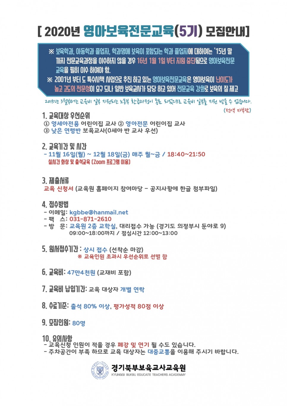 기본과정은 첨부된 신청서를 작성하여 팩스나 메일 접수가능하며,
