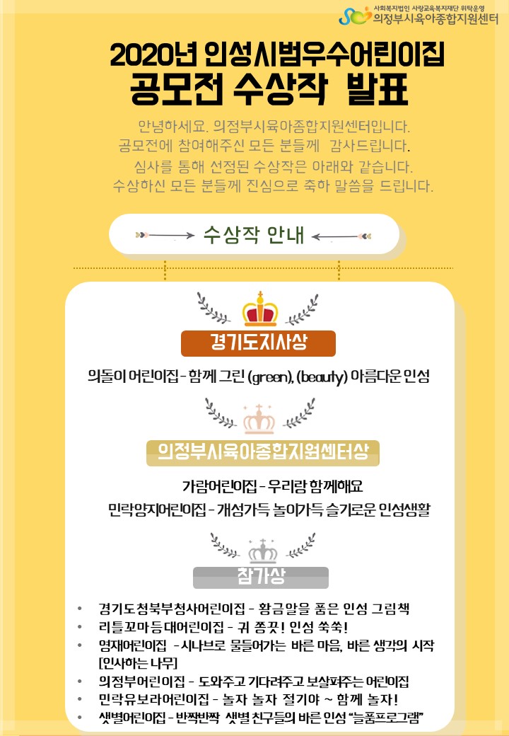 2020년 인성교육 우수어린이집 공모 최종심사 발표 페이지 정보 작성자 의정부센터 댓글 0건 조회 3,491회 작성일 2020-11-04 09:52 본문 ※ 안내 - 시상식: 12월 예정. 자세한 사항은 추후 안내 목록 이전글장난감 나눔장터 20.11.04 다음글구리시 시립어린이집 위탁운영체(자) 모집 공고 20.10.26