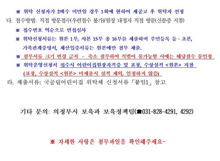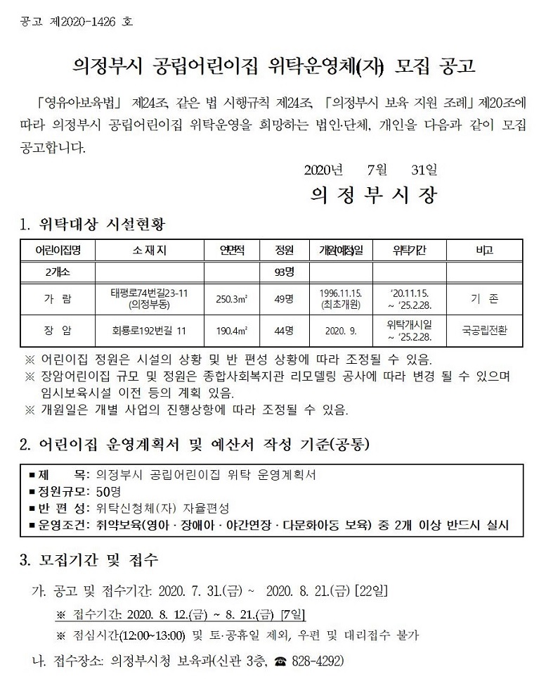 의정부시 공립어린이집 위탁운영체(자) 모집 공고 페이지 정보 작성자 의정부센터 댓글 0건 조회 4,407회 작성일 2020-08-03 17:01 본문 [ 의정부시 공립어린이집 위탁운영체(자) 모집 공고 ] 목록 이전글2020년 영아보육전문교육(3기, 심화과정) 모집안내 20.08.04 다음글의정부시육아종합지원센터 최종 합격자 발표(대체교사) 20.07.30